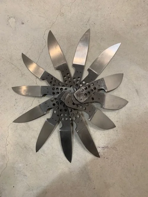 Blades: I practice the “Stock Removal” approach to knife making. I begin with stainless steel bar stock, then design and shape knife blanks through grinding and polishing until I have the final blade profiles. This approach is based on my choosing to work in stainless steel metals—resulting in the highest durability, corrosion resistance, and finish quality. All my knives are full-tang, often with tapered tangs. Full tang provides the strength and design space I seek for the custom stone handles designs I find most rewarding.